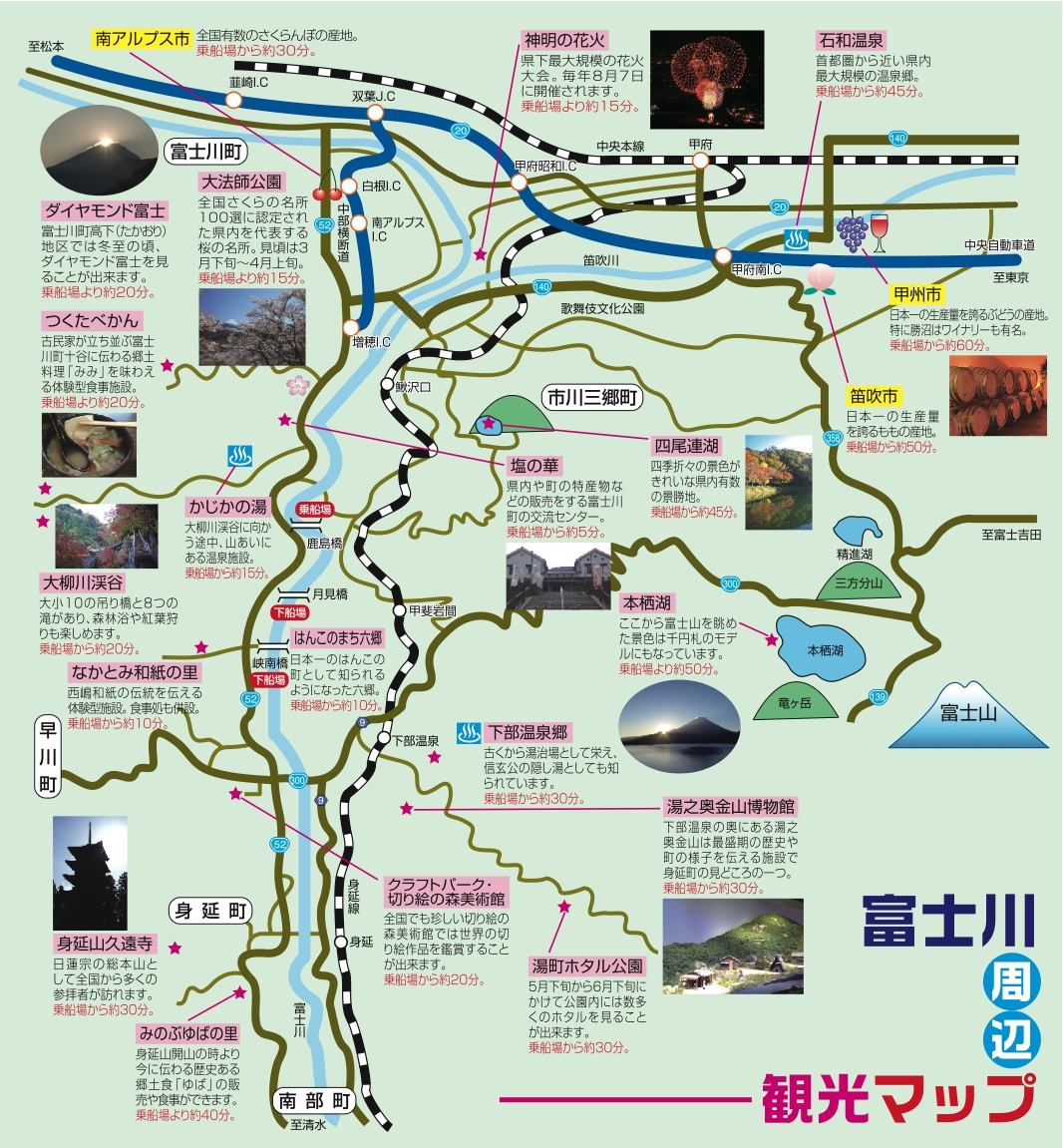 JR東海道本線身延線特急特急は、「甲斐岩間駅」「鰍沢口」どちらにも停車いたします(乗船場所まで同じくらいの距離です)